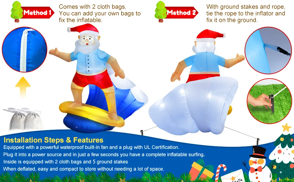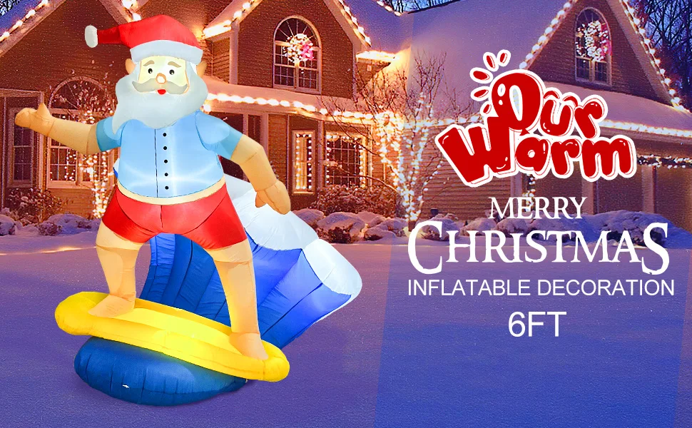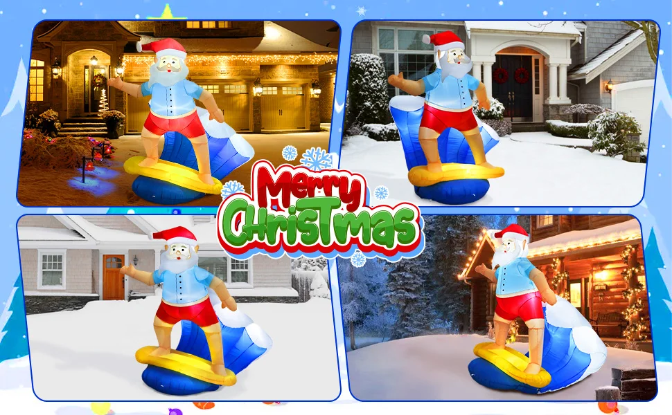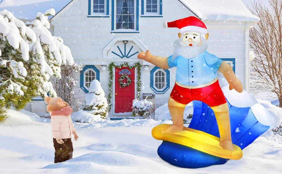 • 【Novelty Christmas Inflatables】: The surfing Santa inflatables outdoor decorations is a unique and fun twist on traditional winter Christmas inflatable decorations. The visually striking image of Santa riding the waves combines the joy and excitement of surfing and Christmas. Santa's red and blue suit against the blue waves brings a sense of novelty and whimsy to your outdoor or indoor décor, making it stand out and appealing to children and adults alike.